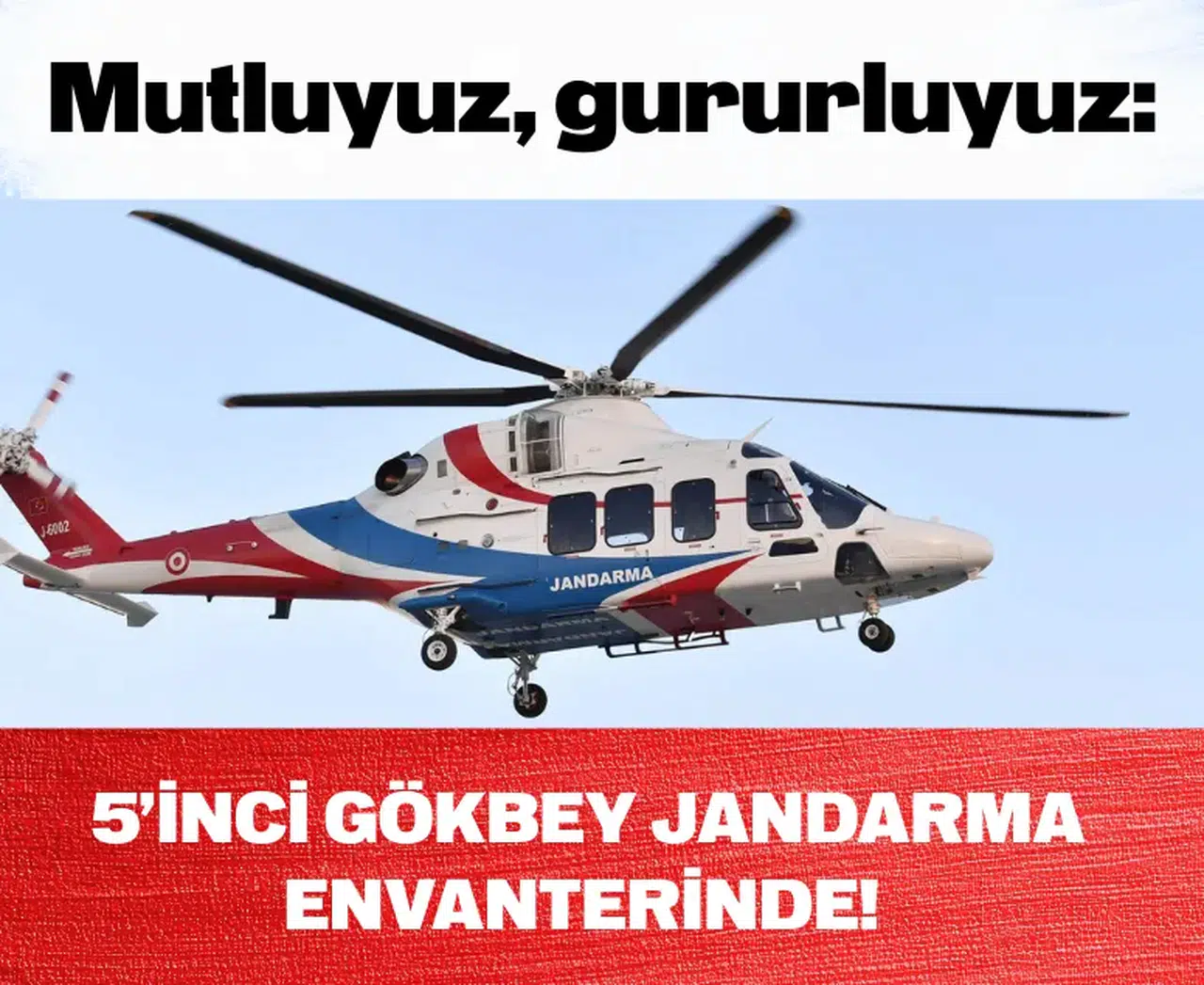 “Gökbey filomuz büyüyor. Jandarma Havacılık Komutanlığımız, 5’inci GÖKBEY helikopterini envanterine kattı. Mutluyuz, gururluyuz.” ifadelerini kullandı.