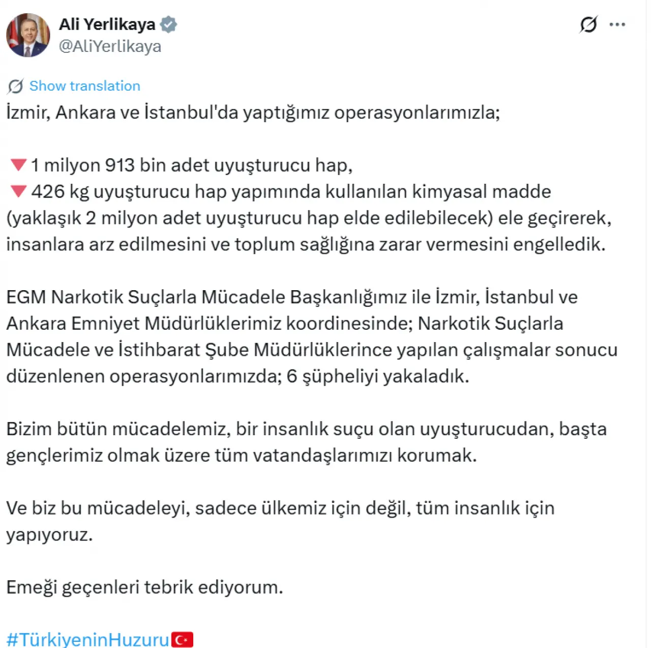 İçişleri Bakanı Ali Yerlikaya, Ankara, İstanbul ve İzmir’de düzenlenen eş zamanlı operasyonlarda 1 milyon 913 bin adet uyuşturucu hap ile uyuşturucu hap yapımında kullanılan 426 kilogram kimyasal maddenin ele geçirildiğini açıkladı.