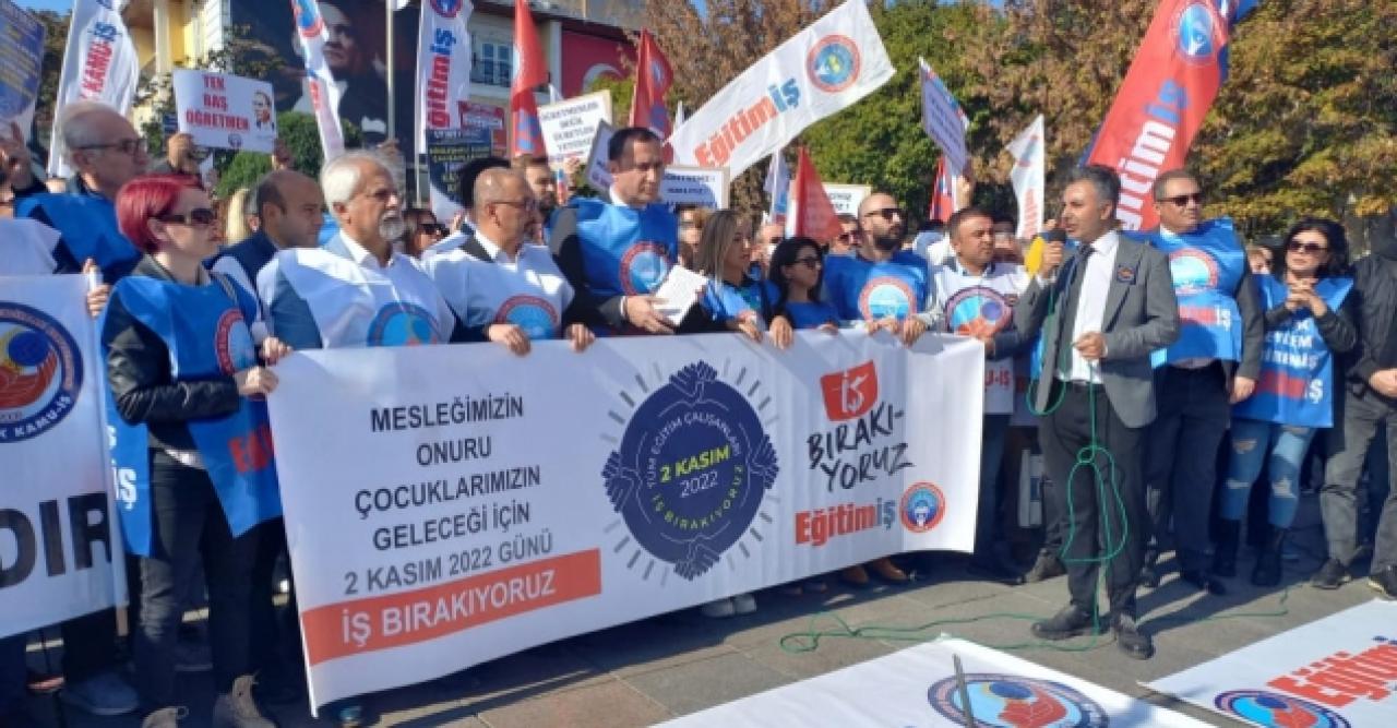 Eğitim-İş Genel Başkanı Kadem Özbay, konuşmasının devamında, “Eğitim-İş’in çağrısı ve bu çağrıya yanıt veren eğitim sendikalarıyla birlikte, Türkiye sendikal mücadele tarihinde neredeyse benzeri olmayan bir ortak duruş birlikteliği oluşturulmuştur” diyerek, “14 eğitim sendikası olarak üretimden gelen gücümüzü kullanacak, iş bırakarak kararlılığımızı gösterecek, ders vereceğiz. Taleplerimiz çok açık. Öğretmenlik Meslek Kanunu geri çekilmeli ve eğitim sendikaları ile tüm eğitim emekçilerinin görüşlerinin de yansıyacağı şekilde yeniden düzenlenmelidir. Sosyal devlet ilkesi gereği, tüm eğitim çalışanlarına giyim, ulaşım, barınma, beslenme, yakıt, kira yardımı yapılmalı ve aile çocuk yardımı tutarları iyileştirilmeli, vergi dilimi adaletsizliğine son verilmelidir. Öğrencilerimize öğretebileceğimiz en büyük değerlerden biri adalet iken eğitimin bu değerden yoksun hale gelmesi kabul edilemez. Kamuda mülakat uygulamasına derhal son verilmeli, her kadro hak edilerek alınmalıdır” dedi.