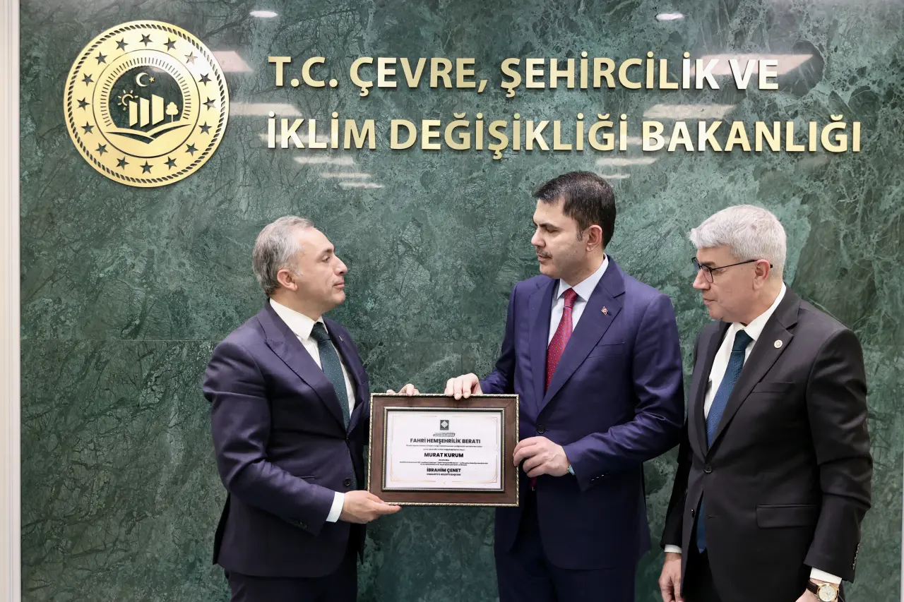 AK Parti Osmaniye Milletvekili Seydi Gülsoy ve Osmaniye Belediye Başkanı İbrahim Çenet, geçtiğimiz ay Bakan Kurum’a Fahri Hemşehrilik Beratı’nı bizzat makamında takdim etmişti.