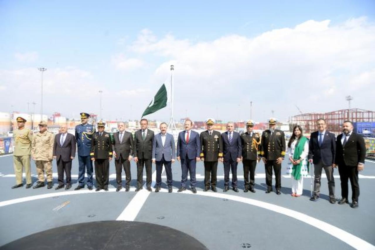 Pakistan Milli Günü'nün de kutlandığı geminin güverte bölümündeki törende Pakistan bayrağı göndere çekilip 2 ülkenin milli marşı söylendi. (DHA)