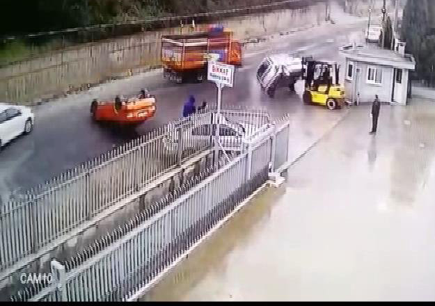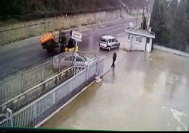 O sırada yoldan araçların geçtiği ve güvenlikçi ve diğer çalışanların olayı izlediği de kameraya yansıyor. Bununla yetinmeyen A.D.’nin tekrar gelerek iki otomobili de forkliftle itip yerde bir süre sürüklediği görülüyor.