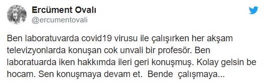 Ovalı ayrıca, kendisi hakkında televizyonda yayınlanan bir programdaki yorumları için bir meslektaşına da sitem etti. Ovalı paylaşımında, “Ben laboratuvarda covid19 virusu ile çalışırken her akşam televizyonlarda konuşan çok unvanlı bir profesör. Ben laboratuarda iken hakkımda ileri geri konuşmuş. Kolay gelsin be hocam. Sen konuşmaya devam et. Bende çalışmaya…” dedi.T24