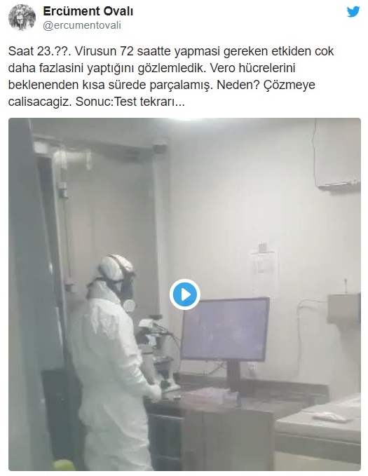 Çalışmalarla ilgili görüntü de paylaşan Ovalı, “Saat 23. Virüsün 72 saatte yapması gereken etkiden çok daha fazlasını yaptığını gözlemledik. Vero hücrelerini beklenenden kısa sürede parçalamış. Neden? Çözmeye çalışacağız. Sonuç: Test tekrarı…” bilgisini verdi.