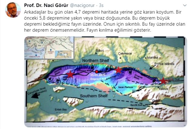 Görür paylaşımında, “Arkadaşlar birkaç kez medyada açıkladım ama anlaşıldığından emin değilim. Buradan bir kez daha yetkilileri uyarmak istiyorum. Kanal İstanbul’un Küçükçekmece- Marmara arası çok riskli. Buradaki kıta sahanlığı Çekmece gölleri açıklarında çok faylı. Bu faylar Kuzeybatı- eğiller, kesitlerde 4-5 km derinlikte. Eldeki sismik kesitlerden tam olarak değerlendirilemiyor" ifadesini kullandı.