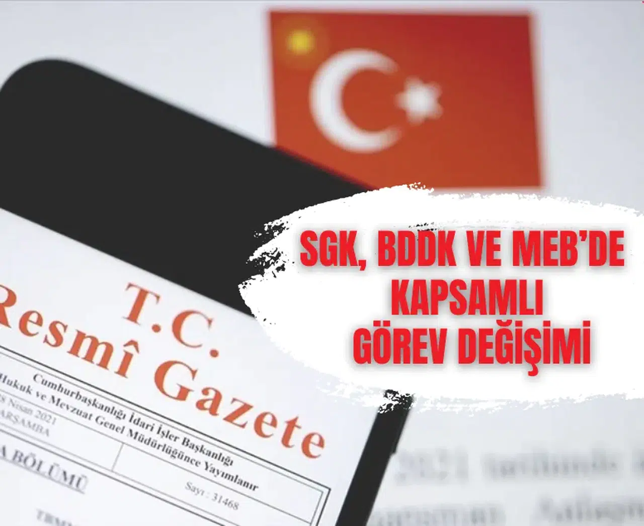 Cumhurbaşkanı Recep Tayyip Erdoğan’ın imzasıyla Resmi Gazete’de yayımlanan atama ve görevden alma kararlarıyla, kamu yönetiminde kapsamlı bir görev değişimi hayata geçirildi. Kararlar doğrultusunda Sosyal Güvenlik Kurumu (SGK), Bankacılık Düzenleme ve Denetleme Kurulu (BDDK) ve Milli Eğitim Bakanlığı (MEB) kadrolarında dikkat çeken atamalar yapıldı.