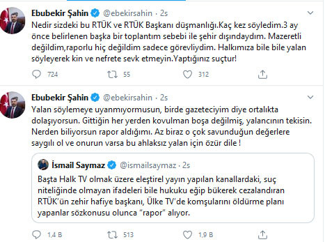 RTÜK Başkanı Ebubekir Şahin, Saymaz'ın sözlerini alıntılayarak iddialara cevap verdi. Şahin, "Yalan söylemeye utanmıyor musun, bir de gazeteciyim diye ortalıkta dolaşıyorsun. Gittiğin her yerden kovulman boşa değilmiş, yalancının tekisin. Nereden biliyorsun rapor aldığımı. Az biraz o çok savunduğun değerlere saygılı ol ve onurun varsa bu ahlaksız yalan için özür dile!" diye yazdı.