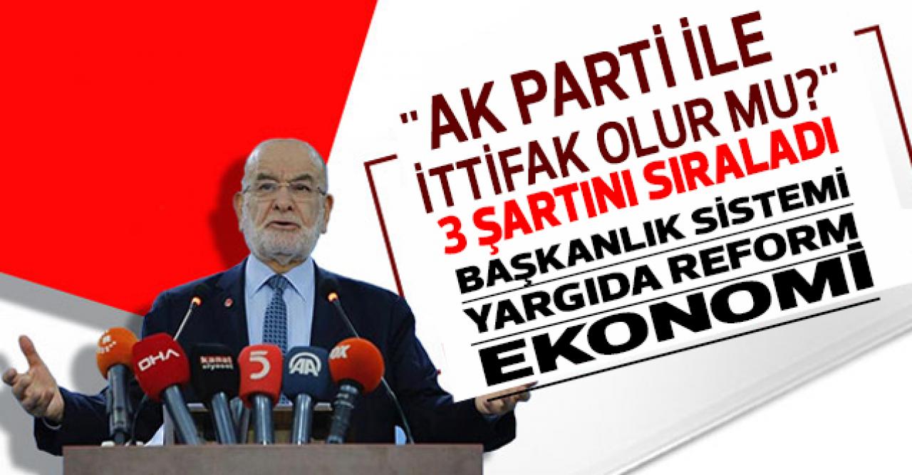 Karamollaoğlu, "Aslında yapılabilir" diyerek ittifakın gerçekleşmesi için gerekli üç şartını sıraladı. O şartlardan birincisinde Karamollaoğlu, başkanlık sisteminin yani şu an mevcut sistemin değiştirilmesi gerektiğini ve partili bir Cumhurbaşkanı olmaması gerektiğini söylüyor. İkinci şart ise adalet alanında yapılacak bazı adımlar ve reformlar. Üçüncü konu başlığı ise ekonomi alanında atılacak adımlar.
