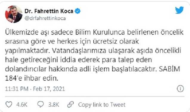 Sağlık Bakanı Koca, son günlerde kendilerine gelen şikayetleri göz önüne alarak söz konusu durumda SABİM 184’ün aranması gerektiğini belirterek şunları söyledi: “Ülkemizde aşı sadece Bilim Kurulunca belirlenen öncelik sırasına göre ve herkes için ücretsiz olarak yapılmaktadır. Vatandaşlarımıza ulaşarak aşıda öncelikli hale getireceğini iddia ederek para talep eden dolandırıcılar hakkında adli işlem başlatılacaktır.”