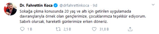 Sosyal medya hesabından mesaj yazan Koca, gençlerden sabırlı olmalarını isteyerek, "Sokağa çıkma konusunda 20 yaş ve altı için getirilen uygulamada davranışlarıyla örnek olan gençlerimize, çocuklarımıza teşekkür ediyorum. Sabırlı olursak, hareketli günlerimize erken döneriz." ifadelerinin kullandı.