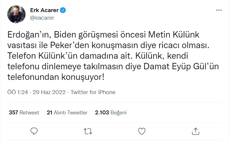 Gazeteci Erk Acarer yayınlanan ses kaydıyla ilgili “Erdoğan’ın, Biden görüşmesi öncesi Metin Külünk vasıtası ile Peker’den konuşmasın diye ricacı olması. Telefon Külünk’ün damadına ait. Külünk, kendi telefonu dinlemeye takılmasın diye Damat Eyüp Gül’ün telefonundan konuşuyor!” iddiasında bulundu.
