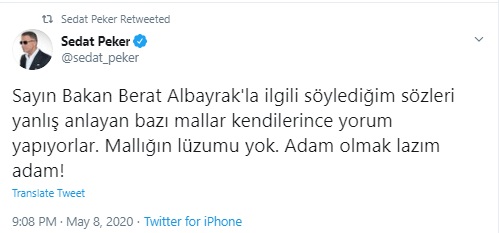 Suç örgütü lideri Sedat Peker, sosyal medya hesabından yapmış olduğu paylaşımda , "Sayın Bakan Berat Albayrak'la ilgili söylediğim sözleri yanlış anlayan bazı mallar kendilerince yorum yapıyorlar. Mallığın lüzumu yok. Adam olmak lazım adam!" açıklamarında bulundu.