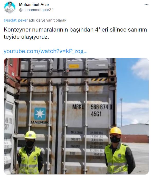Peker’in açıkladığı konteyner numaralarından birinin 2020 Haziran ayında 5 ton kokain ile yakalanan ve Türkiye’ye gönderileceği belirtilen konteynerin numaraları ile eşleşiyor. Sedat Peker’in paylaşımlarına cevap veren ve o dönem Kolombiya televizyonlarında yayınlanan görüntüleri paylaşan Muhammed Acar, “Konteyner numaralarının başından 4'leri silince sanırım teyide ulaşıyoruz.” ifadelerini kullandı.