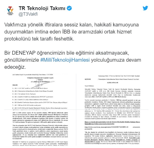 Türkiye Teknoloji Takımı Vakfı'nın (T3 Vakfı) Twitter hesabından yapılan açıklamada, "Vakfımıza yönelik iftiralara sessiz kalan, hakikati kamuoyuna duyurmaktan imtina eden İBB ile aramızdaki ortak hizmet protokolünü tek taraflı feshettik" ifadeleri kullanıldı.