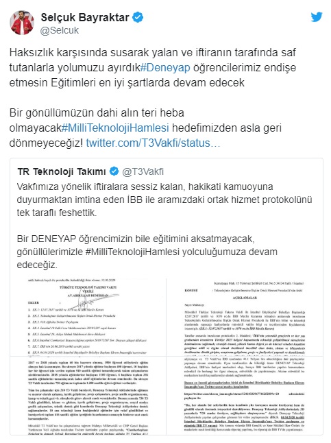 T3 Vakfı Mütevelli Heyeti Başkanı Selçuk Bayraktar da Twitter hesabından şu açıklamayı yaptı: