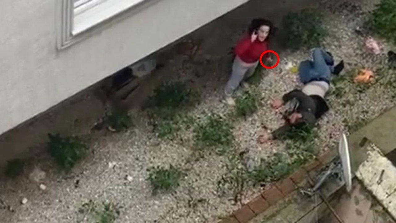 Yerde hareketsiz yatan sevgilisinin yanına gelen G.K., elindeki bıçakla etrafa tehdit savurdu. Kendisini görüntüleyen komşularına da tepki gösteren G.K., "Beni aldatmanın bedeli bu, erkek olun karınıza sahip çıkın'" dedi.