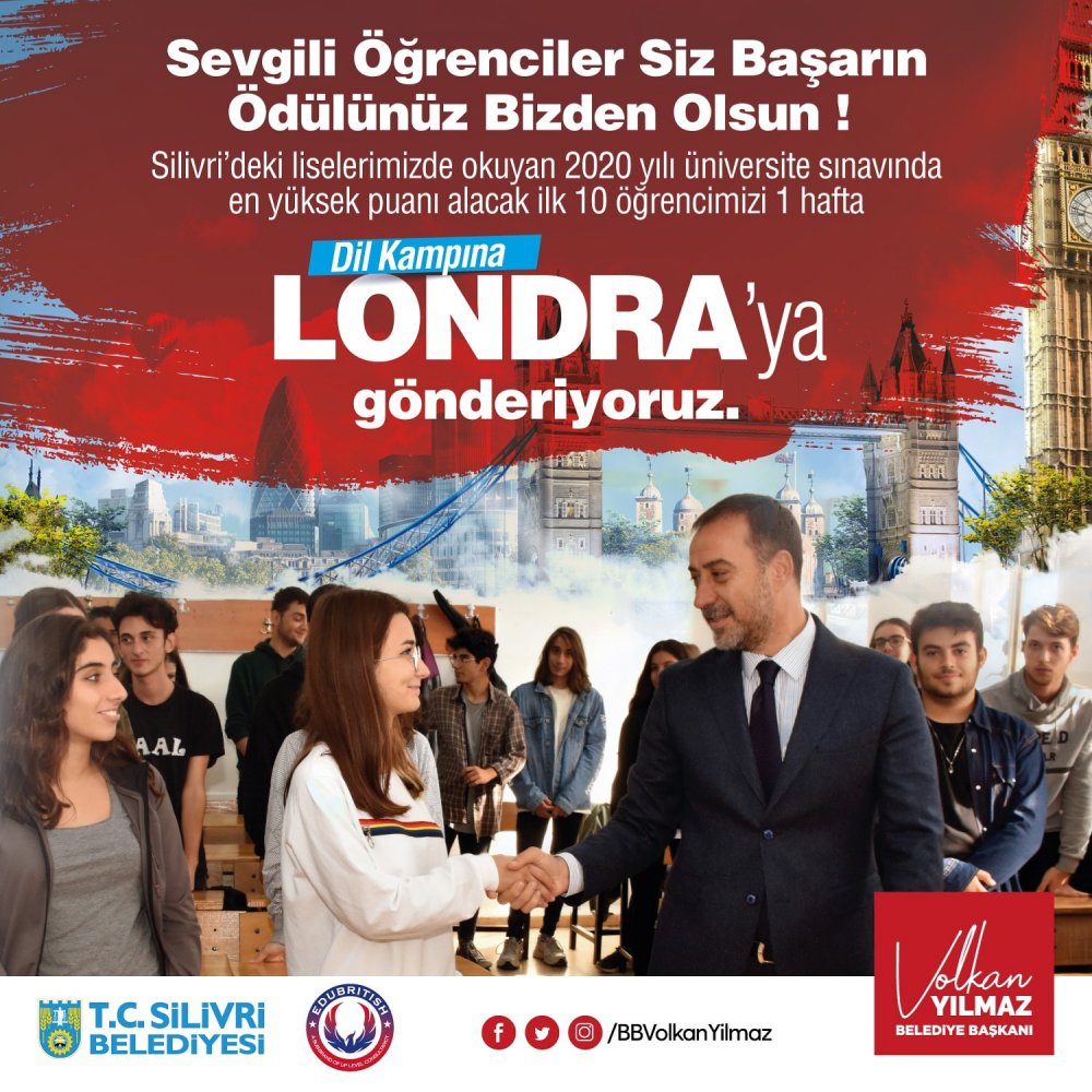 ''Silivri'deki liselerimizde okuyan 2020 yılı üniversite sınavında en yüksek puanı alacak ilk 10 öğrencimizi 1 hafta Dil Kampı için Londra'ya gönderiyoruz. Sınava girecek tüm öğrencilerimize şimdiden başarılar diliyoruz.''