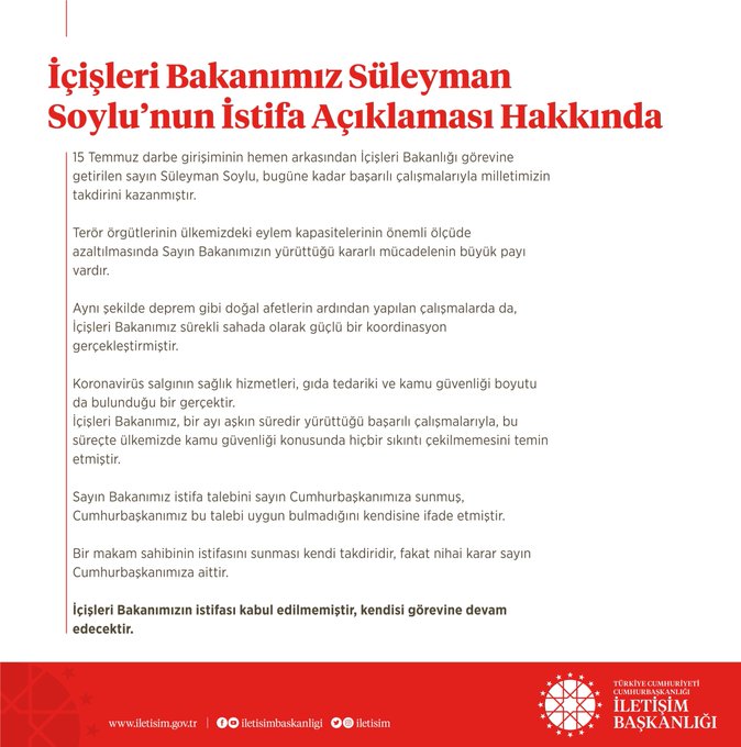İçişleri Bakanımız Sayın Süleyman Soylu’nun istifa açıklaması hakkında Cumhurbaşkanlığı İletişim Başkanlığı açıklaması