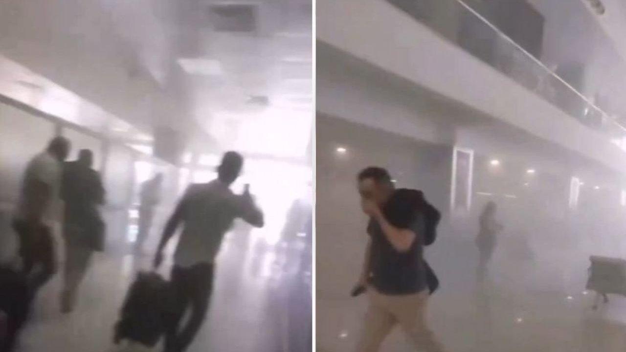 Havalimanında bulunan elektrik panolarından çıktığı tespit edilen yangın nedeniyle bekleme salonları dumanla kaplandı.