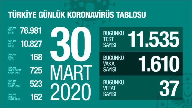 Sağlık Bakanı Fahrettin Koca, Türkiye'de yeni tip koronavirüs salgını nedeniyle yaşamını yitirenlerin sayısının 168'e, toplam vaka sayısının ise ise 10 bin 827'ye yükseldiğini açıkladı.