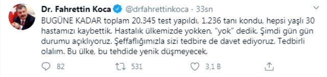 "BUGÜNE KADAR toplam 20.345 test yapıldı, 1.256 tanı kondu, hepsi yaşlı 30 hastamızı kaybettik. Hastalık ülkemizde yokken, “yok” dedik. Şimdi gün gün durumu açıklıyoruz. Şeffaflığımızla sizi tedbire de davet ediyoruz. Tedbirli olalım. Bu ülke, bu tehdide yenik düşmeyecek."