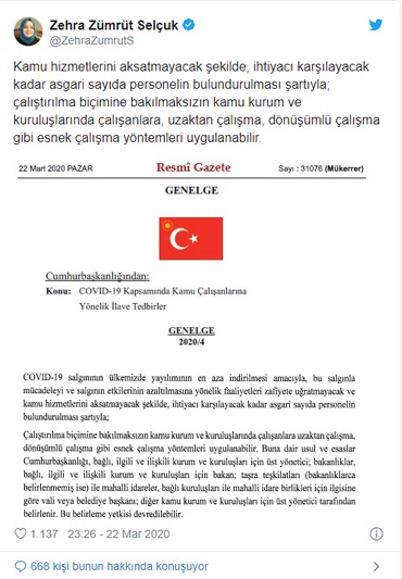 "Kamu hizmetlerini aksatmayacak şekilde, ihtiyacı karşılayacak kadar asgari sayıda personelin bulundurulması şartıyla; çalıştırılma biçimine bakılmaksızın kamu kurum ve kuruluşlarında çalışanlara, uzaktan çalışma, dönüşümlü çalışma gibi esnek çalışma yöntemleri uygulanabilir."