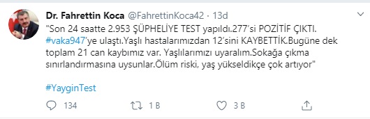 Son 24 saatte 2.953 ŞÜPHELİYE TEST yapıldı. 277’si POZİTİF ÇIKTI. Hasta sayımız 947’ye ulaştı. Yaşlı hastalarımızdan 12’sini KAYBETTİK. Bugüne dek toplam 21 can kaybımız var. Yaşlılarımızı uyaralım. Sokağa çıkma sınırlandırmasına uysunlar. Ölüm riski, yaş yükseldikçe çok artıyor.