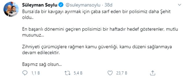 İçişleri Bakanı Süleyman Soylu, Bursa'da şehit olan polis memuruyla ilgili kişisel Twitter hesabından bir paylaşım yaptı. Bakan Soylu, paylaşımında "Bursa'da bir kavgayı ayırmak için çaba sarf eden bir polisimiz daha Şehit oldu. En başarılı dönemini geçiren polisimizi bir haftadır hedef gösterenler, mutlu musunuz. Zihniyeti çürümüşlere rağmen kamu güvenliği, kamu düzeni sağlanmaya devam edilecektir. Başımız sağ olsun." ifadelerini kullandı.