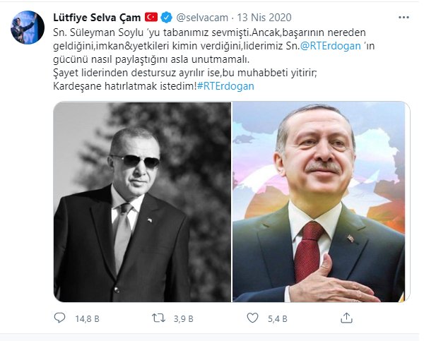 Geçtiğimiz Nisan ayında sosyal medyadan istifa ettiğini duyuran ve ardından vazgeçen İçişleri Bakanı Süleyman Soylu'yu, Lütfiye Selva Çam twitter üzerinden adeta eleştiri yağmuruna tutmuş ve “Sn. Süleyman Soylu’yu tabanımız sevmişti. Ancak, başarının nereden geldiğini, imkan&yetkileri kimin verdiğini,liderimiz Sn.@RTErdogan ’ın gücünü nasıl paylaştığını asla unutmamalı. Şayet liderinden destursuz ayrılır ise, bu muhabbeti yitirir; Kardeşane hatırlatmak istedim!#RTErdogan” ifadelerini kullanmıştı.