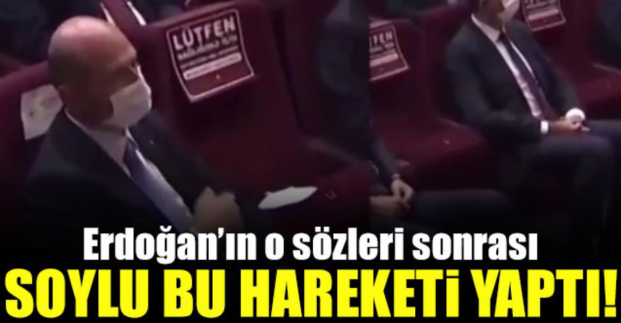 Cumhurbaşkanı ve AK Parti Genel Başkanı Tayyip Erdoğan’ın İçişleri Bakanı Süleyman Soylu hakkındaki sessizliği devam ediyor. Erdoğan'ın yaptığı konuşmada Soylu'nun hareketi ise dikkat çekti.
