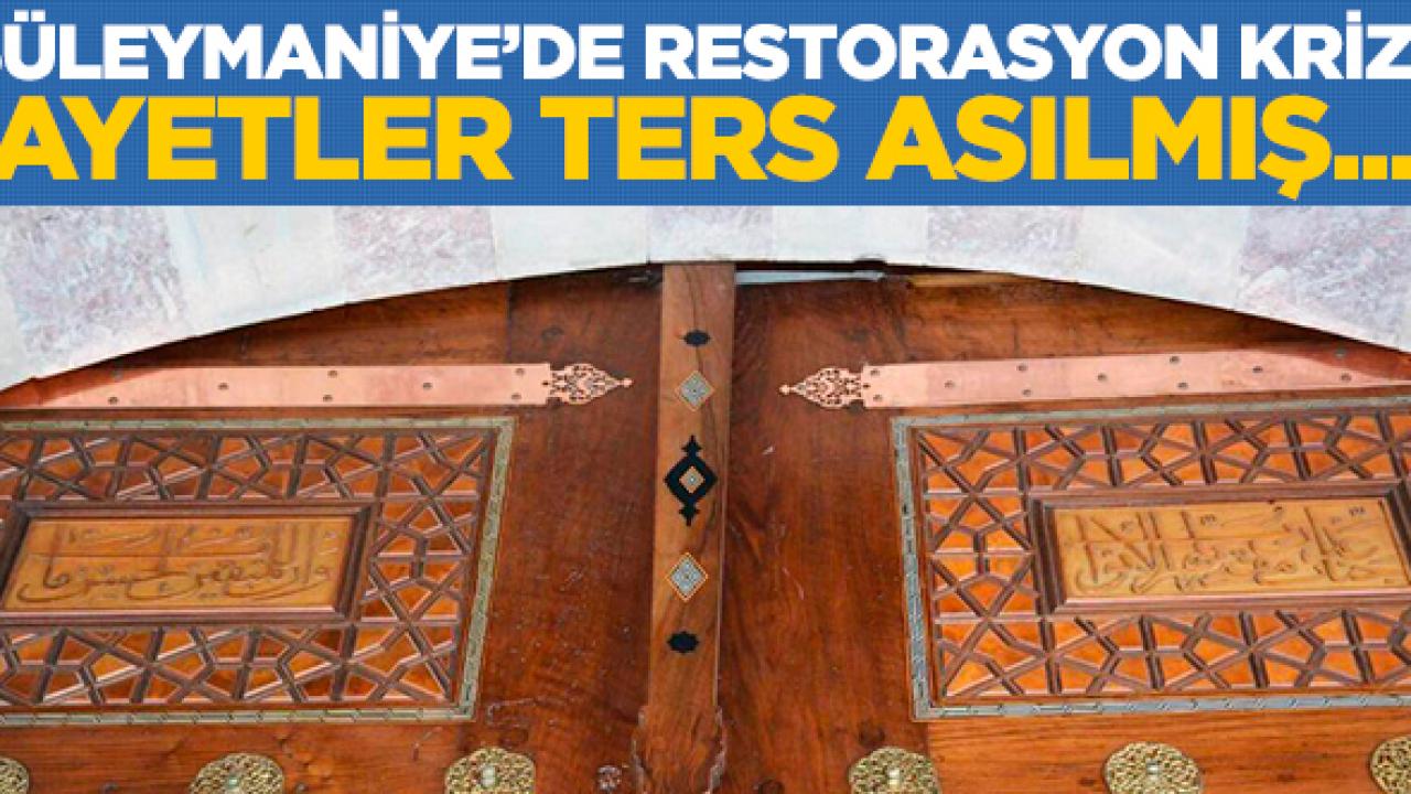 Süleymaniye Camii’nde gerçekleştirilen onarımda, kıbleye göre sol harim kapısında bulunan ayetlerin ters asıldığı ortaya çıktı. Vakıflar Genel Müdürlüğü'nden yapılan açıklamada, 2007-2013 yılları arasında restorasyon yapıldığı belirtilerek, "Bu restorasyon kapsamında Caminin ahşap kapı kanatları üzerinde yer alan ayetlerin bulunduğu kitabelere temizlik dışında bir müdahale yapılmamıştır" denildi