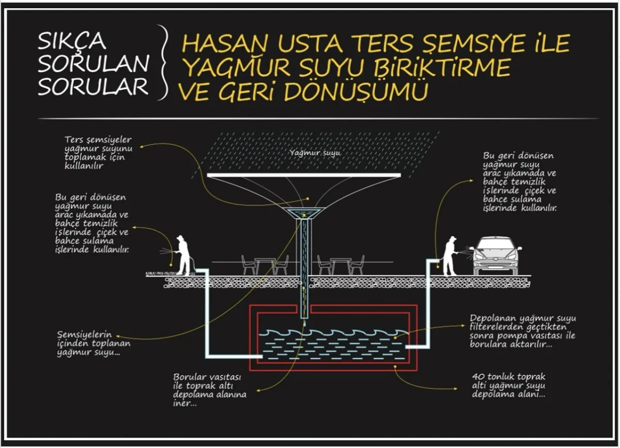 Hasan Usta Kebap, restoran alanında kurduğu ters şemsiye sistemi sayesinde yağmur sularını toplayarak geri dönüştürüyor. Sistemin işleyişine göre; ters şemsiyeler aracılığıyla toplanan yağmur suları, borular vasıtasıyla 40 tonluk yer altı depolama alanına aktarılıyor. Burada filtrelenen sular, güçlü pompa sistemleriyle tekrar kullanım alanlarına yönlendiriliyor.