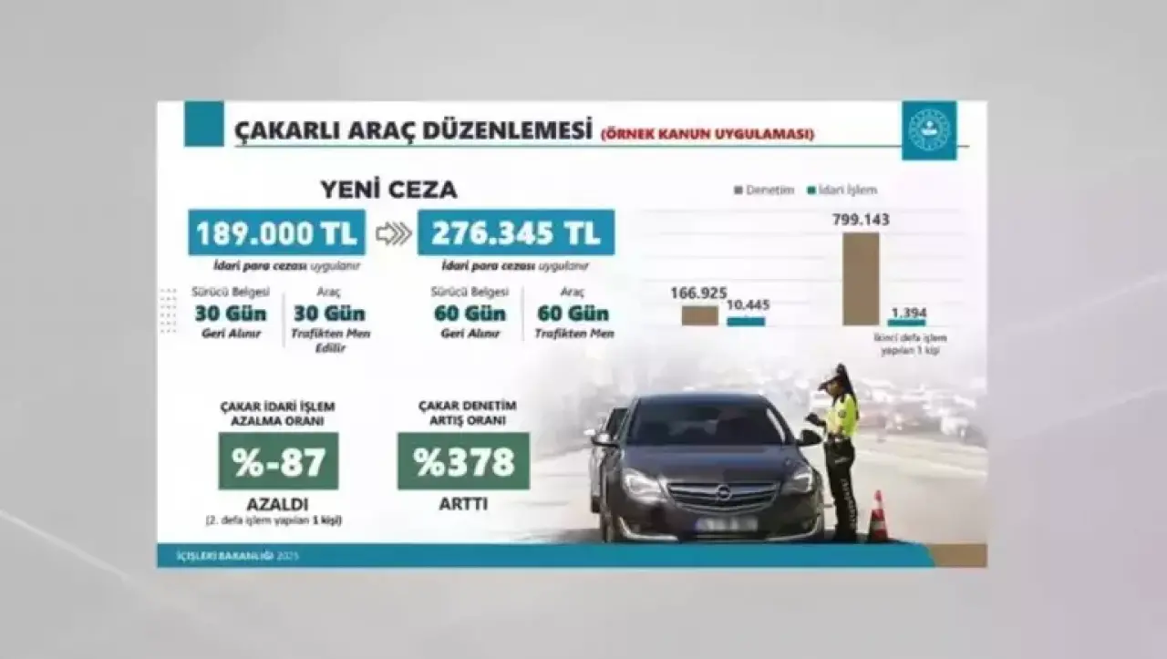 Çakarlı araç kullanımına yönelik cezalar ciddi oranda artırıldı. Mevcut para cezası 189 bin TL iken, yeni uygulamayla birlikte ehliyete el koyma ve aracın trafikten men edilmesi gibi ek yaptırımlar getirildi. Suçun tekrarı hâlinde ise ceza 276 bin TL’ye yükseliyor.
