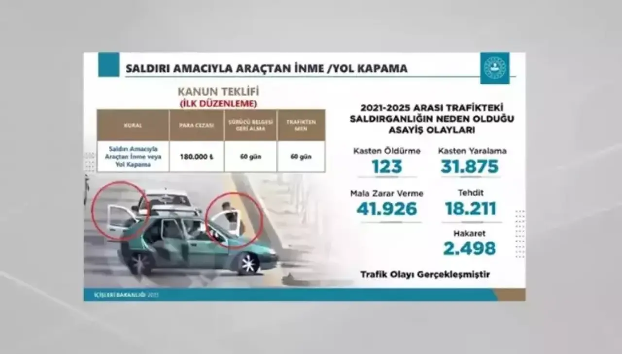 “Makas atma” ve benzeri tehlikeli sürüş davranışlarına yönelik de yeni bir paket devrede. Bu kapsamda, 60 gün ehliyete el koyma, 60 gün araç men’i ve 90 bin TL para cezası uygulanacak. Yerlikaya, yıl sonuna kadar bu davranışların %80 oranında azalmasını beklediklerini söyledi.