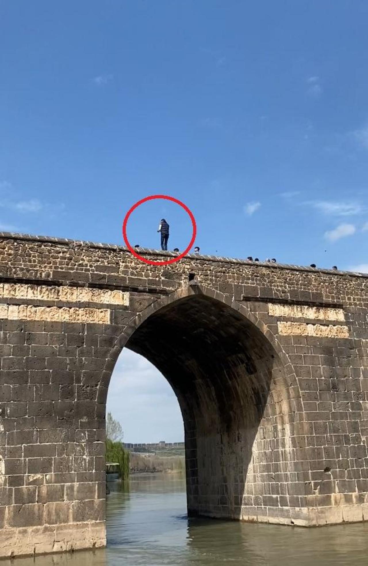 Olay, Sur ilçesinde bulunan tarihi On Gözlü Köprü üzerinde meydana geldi. Hafta sonu yoğunluğunun yaşandığı yerlerden biri olan tarihi On Gözlü Köprüsünde davul zurna çalınması üzerine bir kişi köprünün kemerine çıktı. Çok sayıda kişinin gözü önünde tehlikeye rağmen halay çeken kişi cep telefonu kamerasınca kaydedildi. Metrelerce yükseklikte kişi bir süre sonra köprüden indi. O anlar ise kameralara böyle yansıdı. (DHA)