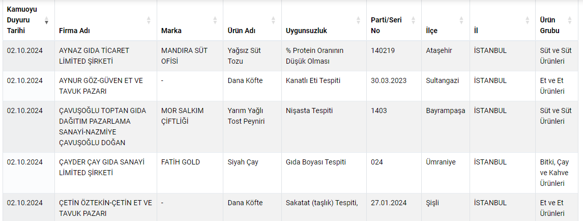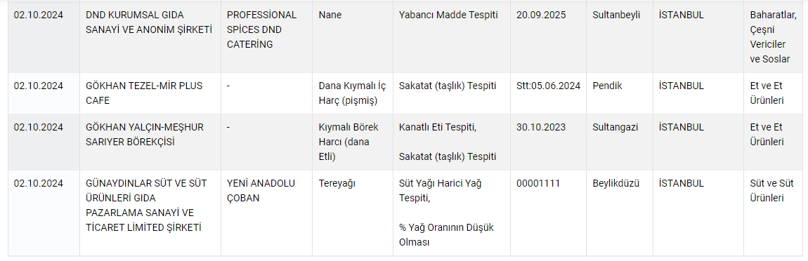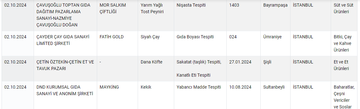 İstanbul'da ki güncel tespit edilen o gıdalardan bazıları