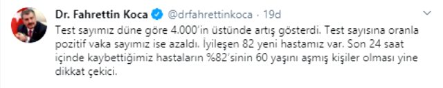 Sağlık Bakanı Fahrettin Koca, Twitter hesabından yaptığı paylaşımda test sayılarındaki artışa dikkat çekti. Koca, "Test sayısına oranla pozitif vaka sayımız ise azaldı. İyileşen 82 yeni hastamız var" dedi.