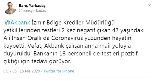 "Akbank İzmir Bölge Krediler Müdürlüğü yetkililerinden testleri 2 kez negatif çıkan 47 yaşındaki Ali İhsan Orallı da Coronavirüs yüzünden hayatını kaybetti. Vefat, Akbank çalışanlarına mail yoluyla duyuruldu. Bankanın 18 personeli de testleri pozitif çıktığı için tedavi görüyor"