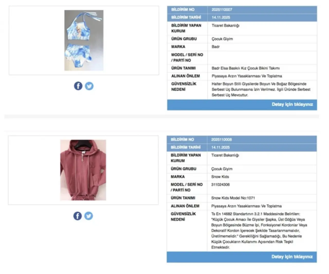 Ticaret Bakanlığı tarafından yapılan son denetimler sonucunda, çocuk sağlığına zarar verme riski taşıdığı belirlenen iki giyim markasına ait ürünler “güvensiz” ilan edildi.