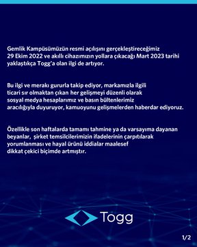 "Gemlik Kampüsümüzün resmi açılışını gerçekleştireceğimiz 29 Ekim 2022 ve akıllı cihazımızın yollara çıkacağı Mart 2023 tarihi yaklaştıkça Togg'a olan ilgi de artıyor. Bu ilgi ve merakı gururla takip ediyor, markamızla ilgili ticari sır olmaktan çıkan her gelişmeyi düzenli olarak sosyal medya hesaplarımız ve basın bültenlerimiz aracılığıyla duyuruyor, kamuoyunu gelişmelerden haberdar ediyoruz. Özellikle son haftalarda tamamı tahmine ya da varsayıma dayanan beyanlar, şirket temsilcilerimizin ifadelerinin çarpıtılarak yorumlanması ve hayal ürünü iddialar maalesef dikkat çekici biçimde artmıştır.