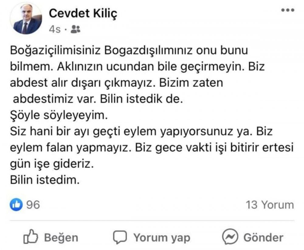 “Boğaziçili misiniz, Boğazdışılı mısınız onu bunu bilmem. Aklınızın ucundan bile geçirmeyin. Biz abdest alır dışarı çıkmayız. Bizim zaten abdestimiz var. Bilin istedik de… Şöyle söyleyeyim. Siz hani bir ayı geçti eylem yapıyorsunuz ya. Biz eylem falan yapmayız. Biz gece vakti işi bitirir ertesi gün işe gideriz bilin istedim.”