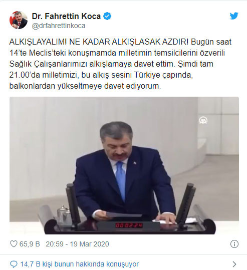 Bugün Meclis’teki konuşmamda milletimin temsilcilerini özverili Sağlık Çalışanlarımızı alkışlamaya davet ettim. Şimdi tam 21.00’da milletimizi, bu alkış sesini Türkiye çapında, balkonlardan yükseltmeye davet ediyorum."