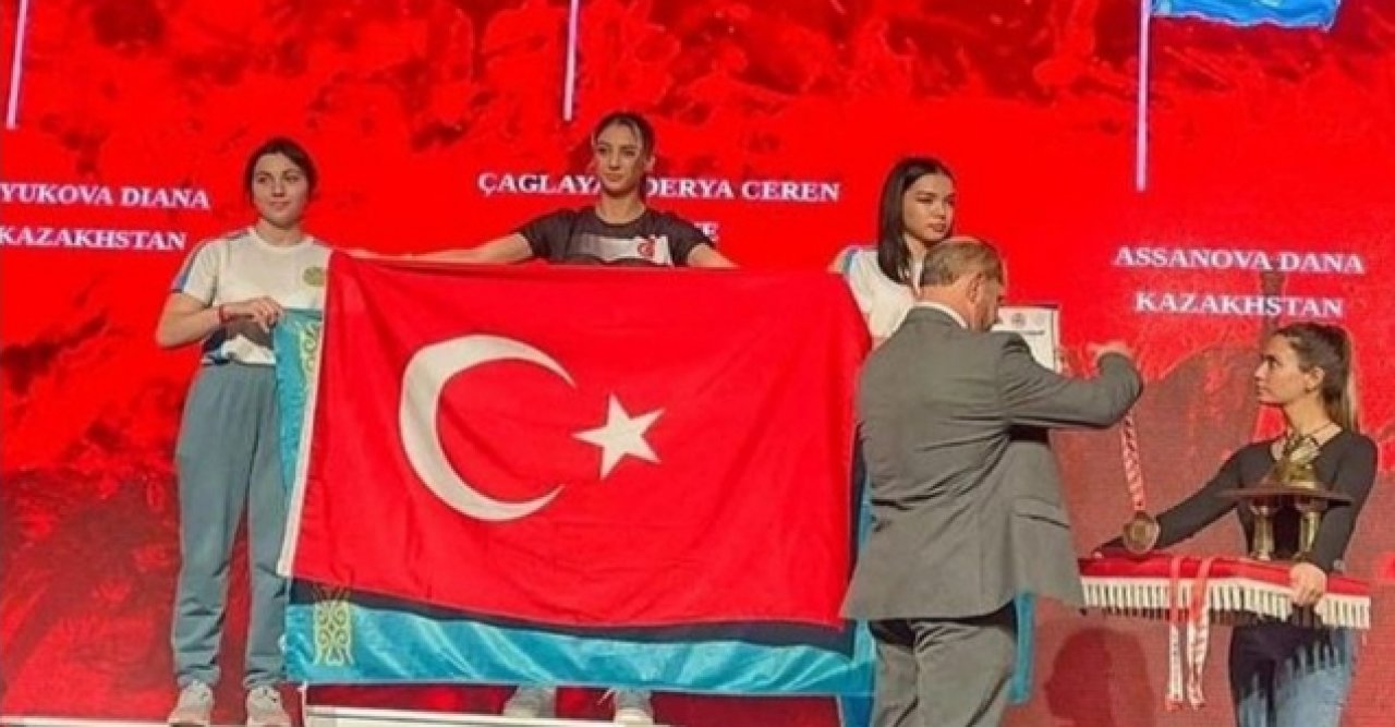 Antalya’da düzenlenen Dünya Bilek Güreşi Şampiyonası’nda 21 yaş altı klasmanda şampiyon olan milli sporcu Derya Ceren Çağlayan, Kazak sporcuların yaptığı nezaketsiz davranış karşısında kayıtsız kalmadı. Milli sporcu Çağlayan, ikinci ve üçüncü olan Kazak sporcuların açtığı Kazakistan bayrağının üstüne Türk bayrağı açtı.