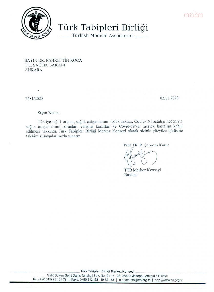 TTB adına Merkez Konseyi Başkanı Şebnem Korur Fincancı adına yapılan başvuruda Türkiye’de sağlık ortamı, sağlık çalışanlarının özlük hakları, Covid-19 hastalığı nedeniyle sağlık çalışanlarının sorunları, çalışma koşulları ve Covid-19’un meslek hastalığı kabul edilmesi hakkında yüz yüze görüşme talebi iletildi.