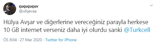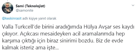 GSM operatörü Turkcell'in korona virüs salgını için ünlülerin 'Evde Kal' çağrılarının abonelere dinletilmesi vatandaşlar tarafından tepkiyle karşılandı. Vatandaşlar sosyal medya hesaplarından, uygulamaya tepki gösterdi. GSM operatörü Turkcell, “Evde Hayat Var” kampanyası için ünlü isimlerle anlaştı. Turkcell kullanan kişiler, birini aradığı zaman Hülya Avşar, Murat Boz, Hadise, Mazhar Alanson veya Ali Poyrazoğlu’nun sesiyle karşılaştı.