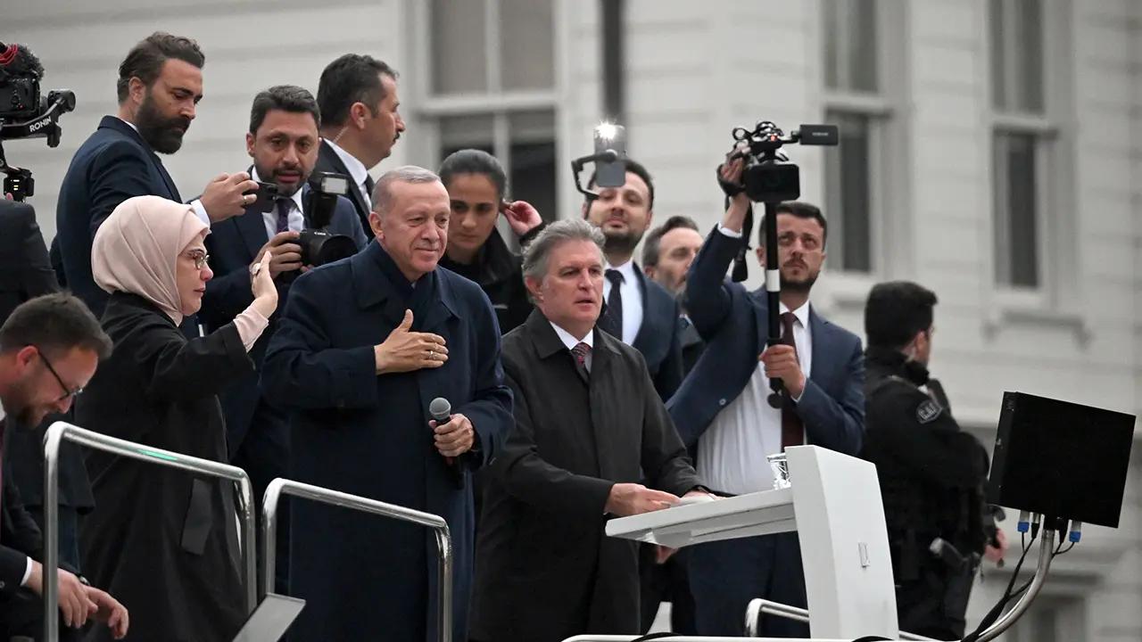 Cumhurbaşkanı Erdoğan konuşmasının sonunda, “Seçimler gelir geçer. Sel gider kum kalır. Asıl olan ülkemizin hedeflerinden sapmaması. Milletimizin birliğine beraberliğine sahip çıkmasıdır. Seçim Sonuçları bir kez daha göstermiştir ki, hiç kimse bu ülkenin kazanımlarına göz dikemez. Az önce Azerbaycan Cumhurbaşkanı İlham Aliyev aradı. Libya Başbakanı aradı. Hepsi ardı ardına arıyorlar. Diyorlar ki, "İlan edin hemen şimdi de geliriz." Katar arıyor. Aynı şekilde mutluluğu paylaşıyor. Hiç kimse milletimize tepeden bakamaz, insanımıza hakaret edemez, gençlerimizi dipsiz karanlıklarına hapsedemez. Hiç kimse milletimizin bir olma, iri olma, kardeş olma, hep birlikte Türkiye olma azmini kıramaz. Şimdi öyle bir haykıralım ki, Ankara bunu duysun. İstanbul'un tüm ilçeleri bunu duysun. Kardeşlerim bu CHP, HDP, İYİ Parti LGBTC' midir? Bizde aile kutsaldır. Aileye kimse dil uzatamaz. Kadına şiddet bizde yasak, haramdır. Ve ümüğünü sıkarız. Önümüzdeki dönemde milletimize ne söz verdiysek, yapacağız. Bu duygularla şimdi Ankara'ya yola çıkıyorum. Bu defa 1 değişiklik yapıyoruz. Balkon konuşmasını inşallah Külliye'den yapacağız. Külliye'den tüm dünyaya sesleneceğiz” dedi.