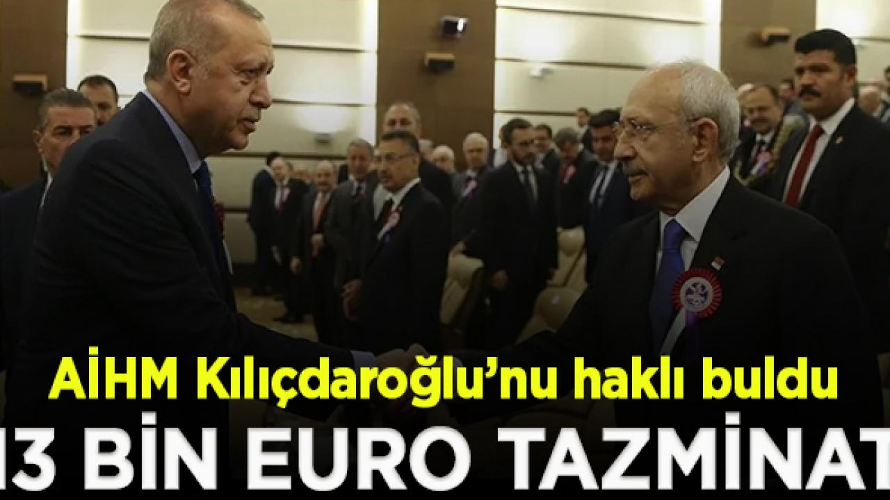 AİHM, Erdoğan'ın Türkiye'de açtığı davalar yüzünden para cezasına mahkum olan Kılıçdaroğlu’nun avukatı Celal Çelik’in yaptığı başvuruda, Türkiye'nin Avrupa İnsan Hakları Sözleşmesi’nin (AİHS) ifade özgürlüğü hakkının korunmasıyla ilgili 10. maddesinin ihlal ettiğine hükmetti. AİHM kararı gereği Türkiye, Kılıçdaroğlu’na yaklaşık 13 bin Euro tazminat ödeyecek.