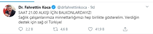 "SAAT 21.00 ALKIŞI İÇİN BALKONLARDAYIZ! Sağlık çalışanlarımıza minnettarlığımızı hep birlikte gösterelim. Verdiğin destek için sağ ol Türkiye!"
