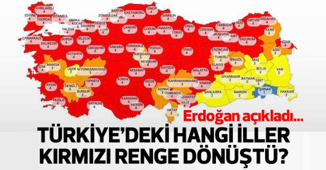 Yeni koronavirüs risk haritası açıklandı. Kabine toplantısı sonrası Cumhurbaşkanı Erdoğan alınan kararları duyurdu ve risk haritası da yayımlandı. Buna göre kırmızı renkte olan illerde hafta sonu sokağa çıkma kısıtlaması yeniden 2 gün olarak belirlendi. Mülki amirler il ve ilçelerde hangi tedbirlerin uygulanacağını risk değerlendirme ölçütlerine göre 4 kategoriye ayrılan harita üzerinden saptayacak. Buna göre Düşük riskli (mavi), orta riskli (sarı), yüksek riskli (turuncu) ve çok yüksek riskli (kırmızı) olarak kategoriler belirlendi.