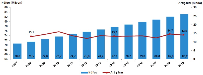 Yıllık nüfus artış hızı 2018 yılında binde 14,7 iken, 2019 yılında binde 13,9 oldu.